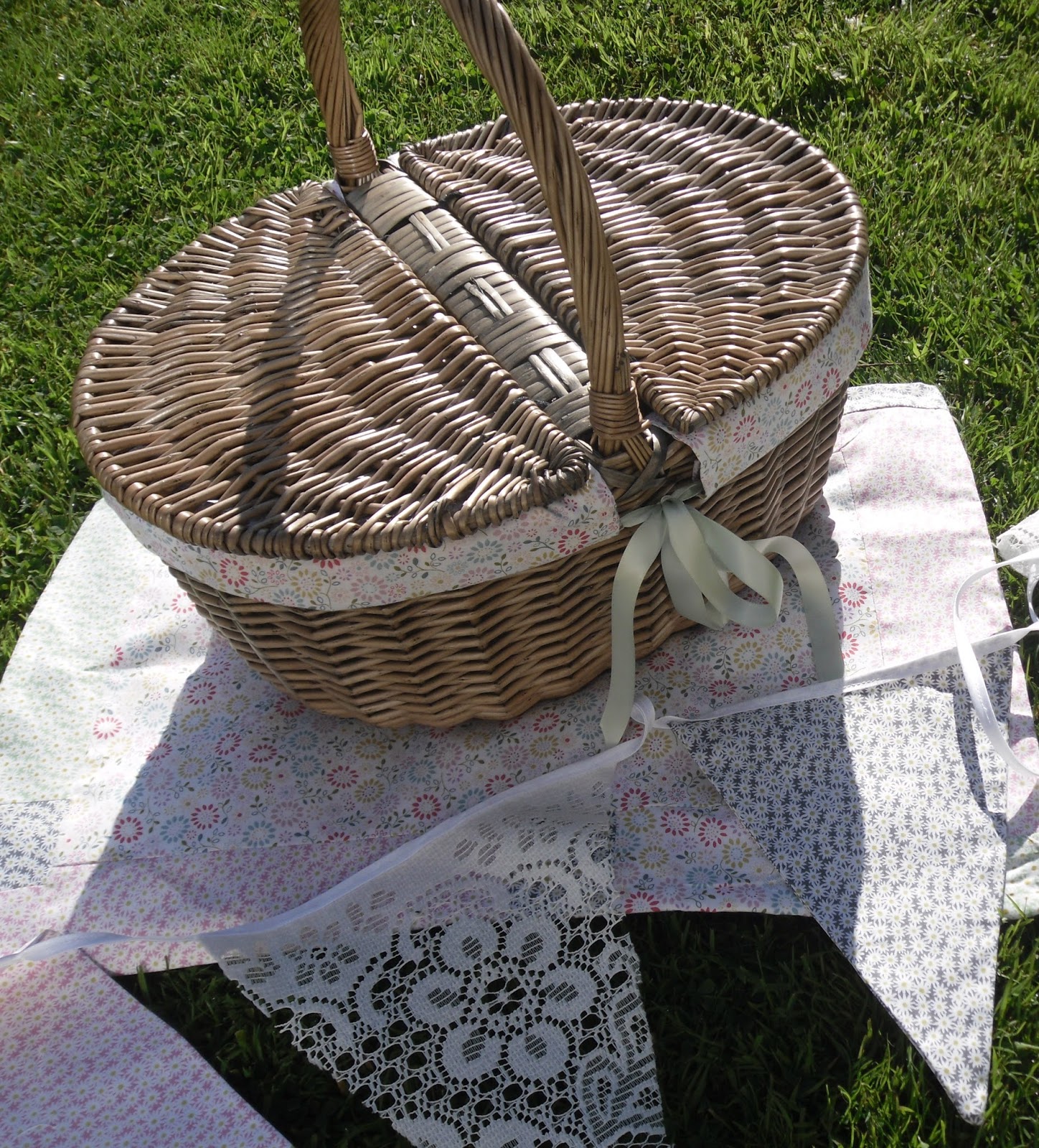 I had some of the pretty fabric left over from my bunting making, not very big pieces but enough to not through away. I considered unpicking the lining that already existed and using that as a template for a new one but I simply did not have enough fabric left, so I simply tacked on what I had to the edge of the lining ensuring that I had a neat finish. I undid the ties that were there and added in some coordinating ribbon. With more fabric I created a simple little patchwork table cloth. It's small, but will easily fold up and take up a small amount of space in the basket. Viola !