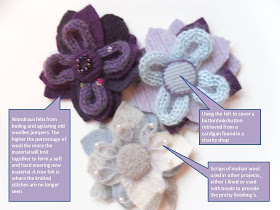 Last week I finished my 1st flower brooches made from recycled woollen jumpers. They are really cool. I can't wait til I get source some more woollen jumpers of different colours , but until then these 3 purple / blue combinations will do as a preview.